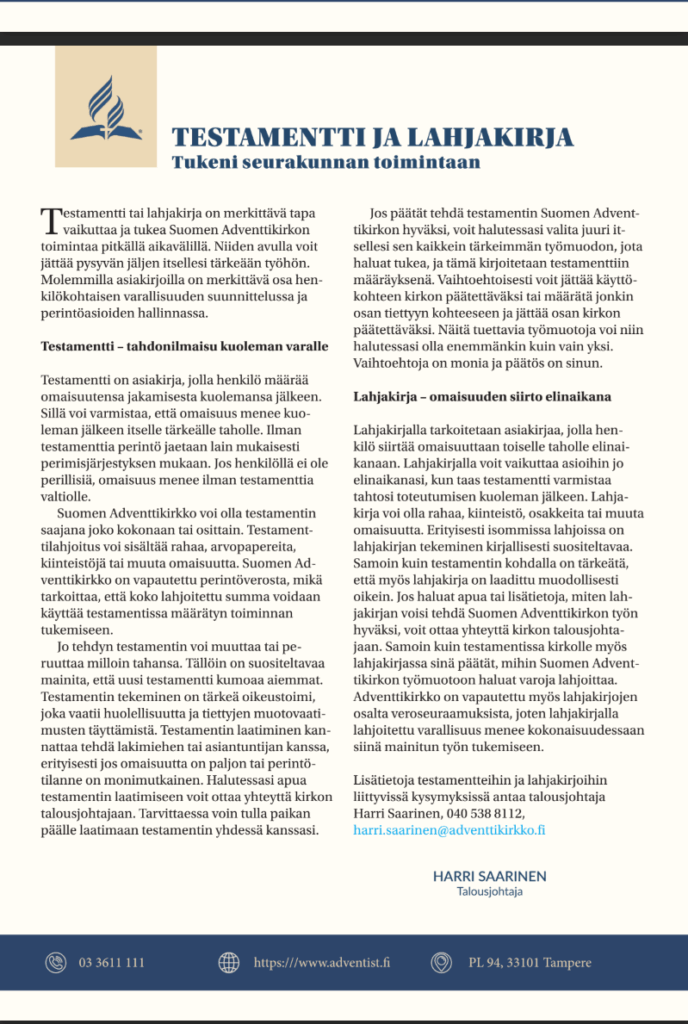 Lisätietoja testamenttiin ja lahjakirjaan liittyvissä kysymyksissä antaa talousjohtaja Harri Saarinen puh. 040 538 8112, harri.saarinen@adventtikirkko.fi